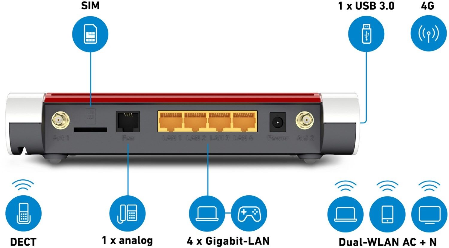 An der integrierten TK-Anlage können ein analoges Telefon oder ein Faxgerät sowie bis zu sechs DECT-Schnurlostelefone (z.B. FRITZ!Fon) angemeldet werden. Per WLAN und FRITZ!App Fon werden auch Smartphones zum vollwertigen Festnetz-/VoIP-Telefon. Mehrere integrierte Anrufbeantworter, lokale und Online-Telefonbücher sowie zahlreiche Komfortfunktionen vervollständigen das breite Telefonieangebot der FRITZ!Box 6850 LTE. Über die DECT-Basisstation können Smarthome-Geräte, wie die schaltbaren Steckdosen FRITZ!DECT 200 und 210 sowie der Heizkörperregler FRITZ!DECT 301, der Vierfachtaster FRITZ!DECT 440 oder die LED-Glühbirne FRITZ!DECT 500 angebunden werden. Für zusätzlichen Komfort sorgt die unkomplizierte Integration in Türsprechanlagen.