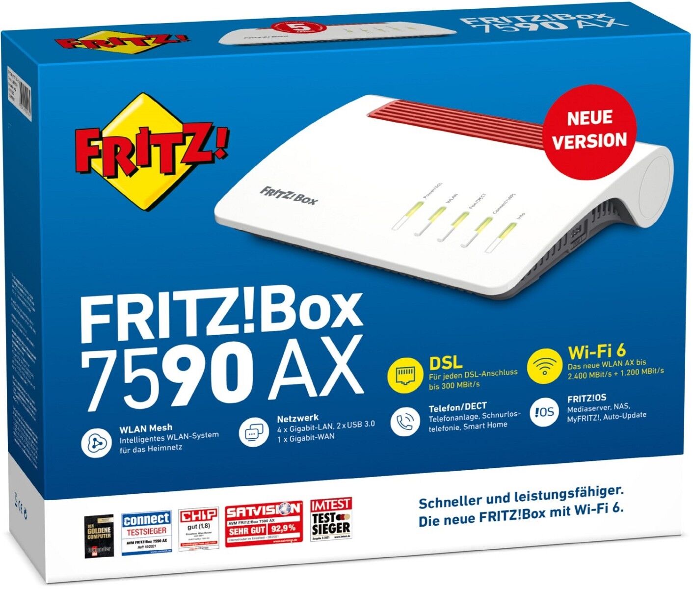 Die FRITZ!Box 7590 AX mit innovativem Wi-Fi 6 (WLAN AX) bringt ultraschnelles WLAN ins Heimnetz. Der Standard Wi-Fi 6 (WLAN AX) ist nochmals schneller und deutlich effizienter: mehrere parallele Anwendungen wie 4K-Streams, Video-Konferenzen und Cloud- Anwendungen meistert die FRITZ!Box 7590 AX mühelos. Ausgestattet mit zukunftssicherem VDSL Supervectoring 35b ermöglicht die FRITZ!Box Internetgeschwindigkeiten von bis zu 300 MBit/s am Anschluss. Gigabit-LAN, USB 3.0 und die DECT-Basis für schnurlose Telefonie und Smarthome-Anwendungen komplettieren das vielseitige Kommunikationsangebot im Heimnetz ab.
