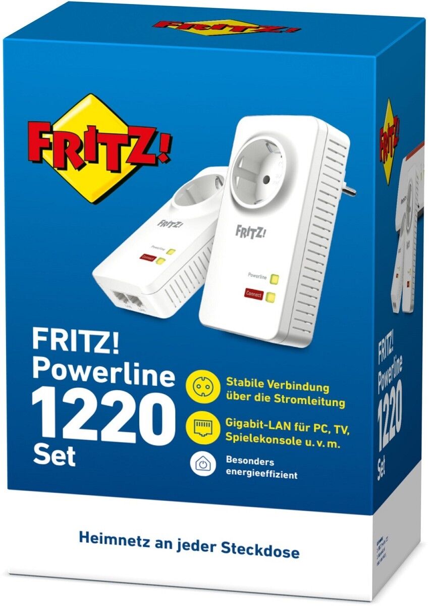 Das FRITZ!Powerline 1220 Set verbindet netzwerkfähige Geräte wie Computer, Fernseher oder Spielekonsolen zuverlässig und schnell auch über große Entfernungen im Heimnetz. Je Adapter stehen 2 ultraschnelle Gigabit-LAN-Anschlüsse zur Verfügung. Mit der Vernetzung über die Stromleitung werden lange Distanzen sowie Hindernisse, wie Wände und Decken, spielend gemeistert. Gegenüber Powerline-Adaptern der 500- und 200-MBit/s-Klasse ermöglicht FRITZ!Powerline 1220 deutlich mehr Übertragungskapazität und robustere Verbindungen – bei hoher Energieeffizienz. Mehrere anspruchsvolle Breitband-Anwendungen werden so im Parallelbetrieb nutzbar.
