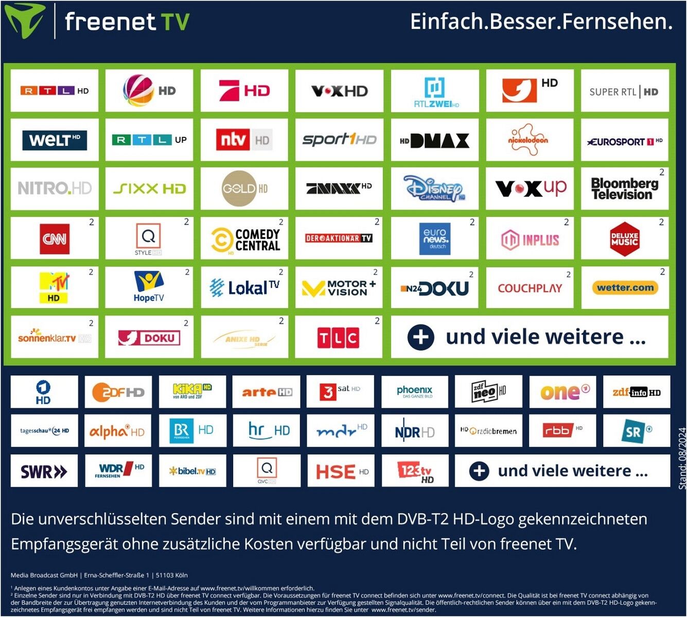 ² Einzelne Programme sind nur in Verbindung mit DVB-T2 HD über das freenet TV connect Angebot verfügbar. Die Voraussetzungen für freenet TV connect finden sich unter www.freenet.tv/connect. Die Qualität ist bei freenet TV connect abhängig von der Bandbreite der zur Übertragung genutzten Internetverbindung des Kunden und der vom Programmanbieter zur Verfügung gestellten Signalqualität. Die öffentlich-rechtlichen Programme können über ein mit dem DVB-T2 HD gekennzeichnetem Empfangsgerät frei empfangen werden und sind nicht Teil von freenet TV. Weitere Informationen zu den genauen Programmen entnehmen Sie unter www.freenet.tv/programme.