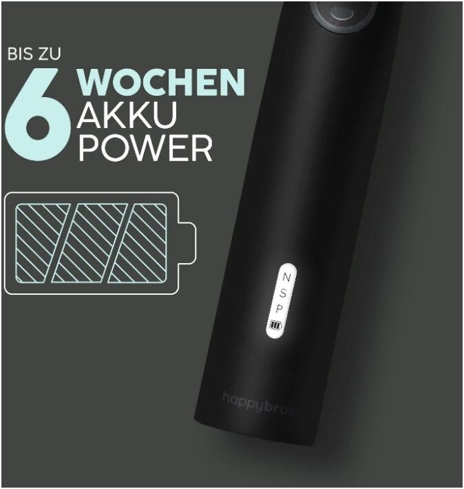 LEISTUNGSSTARKER POWER-AKKU: Mit bis zu 6 Wochen Batterielaufzeit und praktischem Travel-Lock macht die happybrush dein Badezimmer nachhaltiger und ist gleichzeitig deine perfekte Reisezahnbürste.